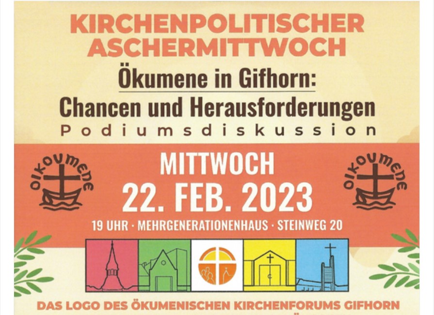 Herzliche Einladung zur Podiumsdiskussion zum Thema: Ökumene in Gifhorn – Chancen und Herausforderungen am Mittwoch, 22.02.2023, 19.00 Uhr im Mehrgenerationenhaus in Gifhorn, Steinweg 20.