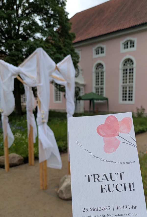 Es war einfach wundervoll! Rund um die St. Nicolaikirche in Gifhorn fanden spontane und angemeldete Trauungen und Segnungen statt. An den fest vereinbarten Terminen und auch spontan kamen junge und ältere Paare, mit und ohne Gäste … es war bunt gemischt. Trotz des Regenwetters waren die Momente, die wir erleben durften, durchweg berührend. Einige Trauungen und Segnungen fanden in der Kirche statt, andere draußen zwischen den Blumen im Kirchgarten unter einem Pavillon.