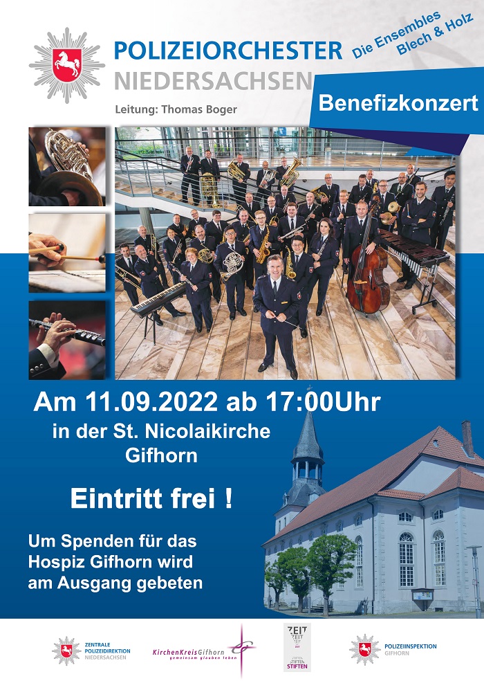 Am Sonntag, dem 11. September 2022, um 17.00 Uhr, findet in der Nicolaikirche Gifhorn ein Benefiz-Konzert des Polizeiorchesters Niedersachen zugunsten des Hospizes Gifhorn statt.