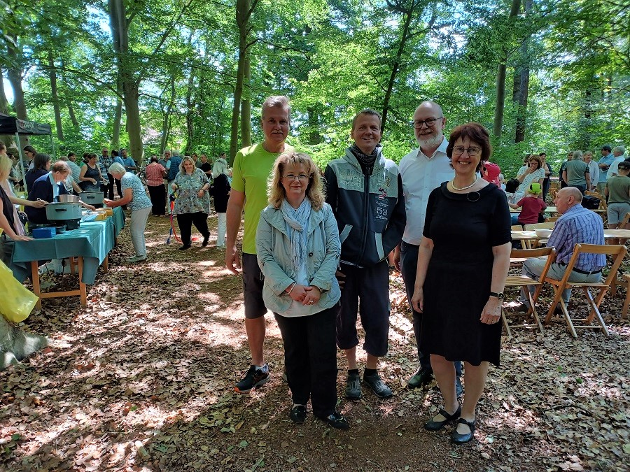 Foto: Nach dem Waldgottesdienst: v.l. Stefan Grüner, Angela Lippe, Martin Voigt (alle Kirchenvorstand St. Petri), Pastor Jürgen Harting und Superintendentin Sylvia Pfannschmidt blicken auf eine bereichernde Woche zurück.