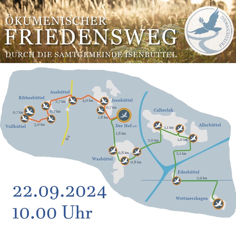 Herzliche Einladung zum ökumenischen Friedensweg! Es ist wieder so weit: Die Region Südost lädt zum Wandern für den Frieden ein. Am Sonntag, 22. September werden zwei Wanderungen angeboten, die sich am frühen Nachmittag auf „Dem Hof e.V.“ in Isenbüttel treffen. Hier gibt es dann einen Gottesdienst mit Posaunenchor, den Hof-Musikanten und Kaffee und Kuchen.
